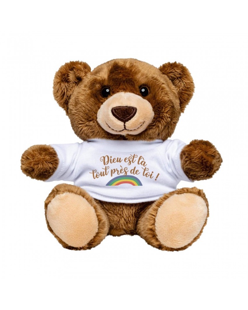 L'adorable ourson «Teddy», apporte un message plein de tendresse grâce à son tee-shirt blanc orné d'un design coloré et le texte : « Dieu est la, tout près de toi.»